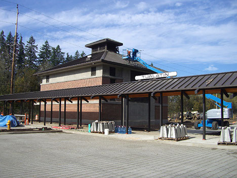 The new station was being constructed in Tualatin Park at the intersection of an elevated railroad trestle and the new commuter rail to the City of Tualatin. The 28-mgd station is a 60-foot deep caisson with a two-story station. A second story entry provides protection from flooding. Due to the confined and sensitive area that the station was constructed in, the architecture was carefully considered to provide the look of a historic railroad station. In addition, improvements to public facilities in Tualatin Park have been incorporated into the project that include: a new pedestrian bridge crossing the Tualatin River that connects the park to the extensive trail system on the north side of the river, upgrades to existing soccer fields, a dog park, an expanded pervious pavement parking lot, and a picnic structure. The station was designed to incorporate many sustainable features that meet LEED Silver rating.